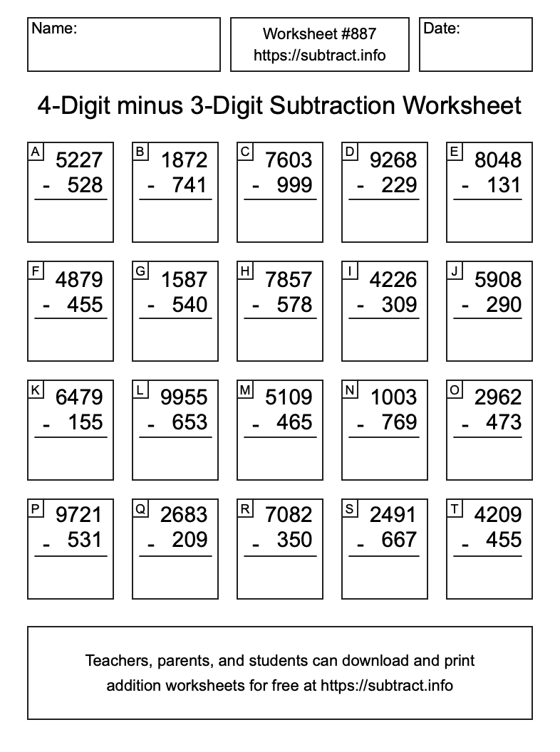 Here is the 4-Digit minus 3-Digit Subtraction Worksheet #887. Print and/or save the worksheet using the buttons below the image. You can also drag or right-click on the image to download it to your device.