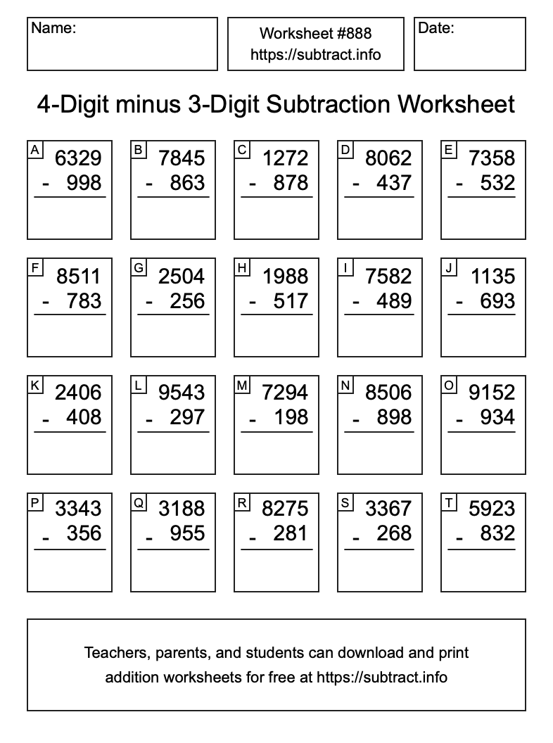 Here is the 4-Digit minus 3-Digit Subtraction Worksheet #888. Print and/or save the worksheet using the buttons below the image. You can also drag or right-click on the image to download it to your device.