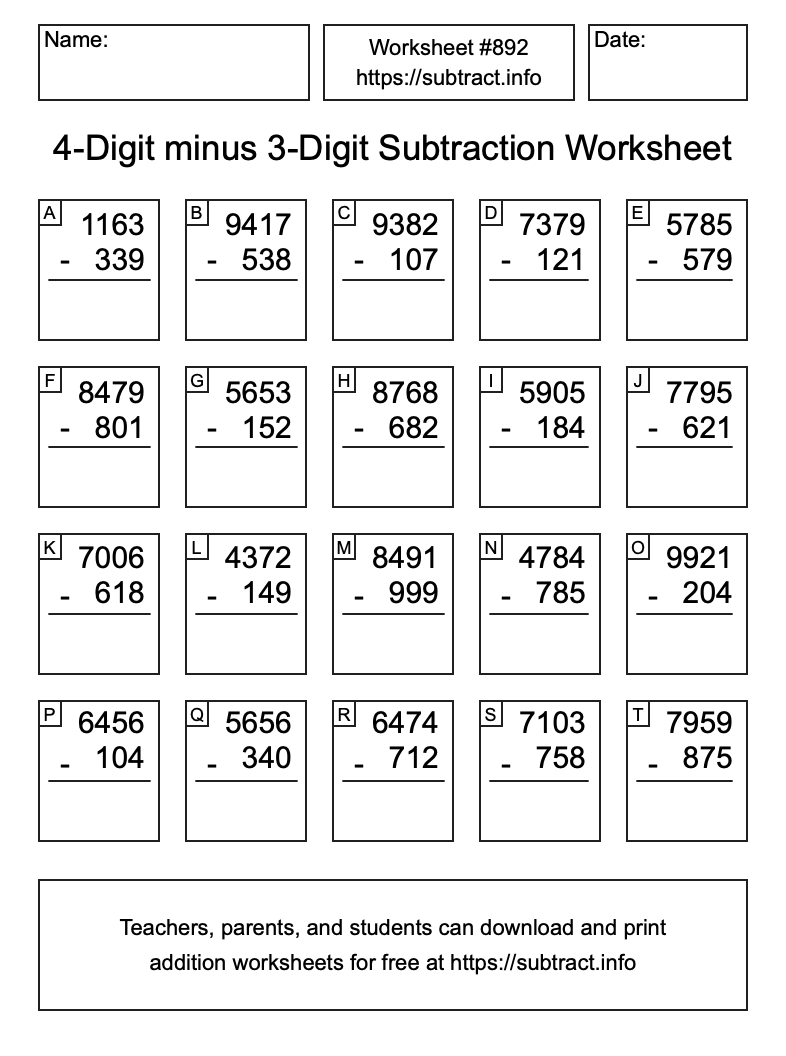 Here is the 4-Digit minus 3-Digit Subtraction Worksheet #892. Print and/or save the worksheet using the buttons below the image. You can also drag or right-click on the image to download it to your device.