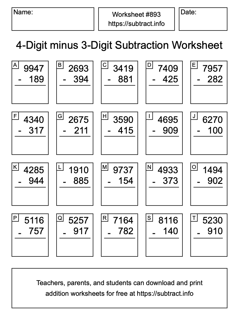Here is the 4-Digit minus 3-Digit Subtraction Worksheet #893. Print and/or save the worksheet using the buttons below the image. You can also drag or right-click on the image to download it to your device.