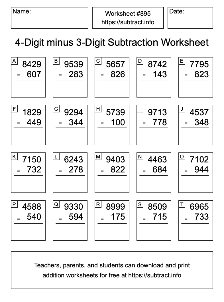 Here is the 4-Digit minus 3-Digit Subtraction Worksheet #895. Print and/or save the worksheet using the buttons below the image. You can also drag or right-click on the image to download it to your device.