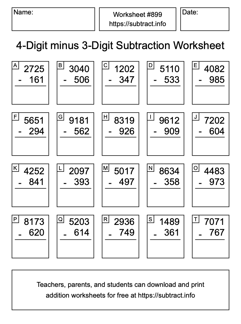 Here is the 4-Digit minus 3-Digit Subtraction Worksheet #899. Print and/or save the worksheet using the buttons below the image. You can also drag or right-click on the image to download it to your device.
