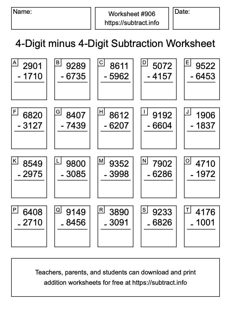 Here is the 4-Digit minus 4-Digit Subtraction Worksheet #906. Print and/or save the worksheet using the buttons below the image. You can also drag or right-click on the image to download it to your device.
