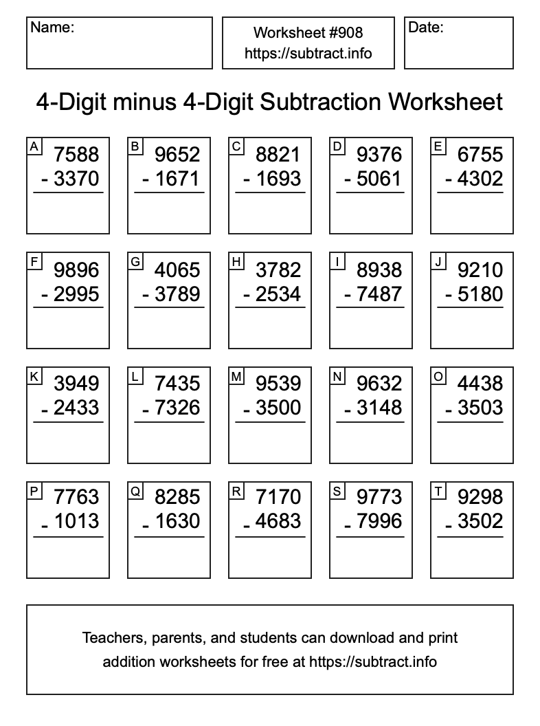 Here is the 4-Digit minus 4-Digit Subtraction Worksheet #908. Print and/or save the worksheet using the buttons below the image. You can also drag or right-click on the image to download it to your device.