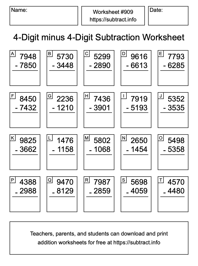 Here is the 4-Digit minus 4-Digit Subtraction Worksheet #909. Print and/or save the worksheet using the buttons below the image. You can also drag or right-click on the image to download it to your device.