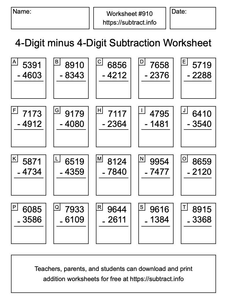 Here is the 4-Digit minus 4-Digit Subtraction Worksheet #910. Print and/or save the worksheet using the buttons below the image. You can also drag or right-click on the image to download it to your device.