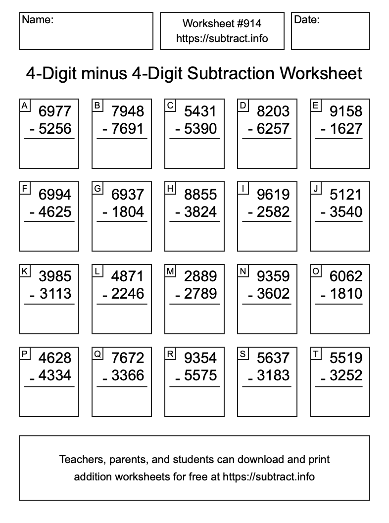 Here is the 4-Digit minus 4-Digit Subtraction Worksheet #914. Print and/or save the worksheet using the buttons below the image. You can also drag or right-click on the image to download it to your device.