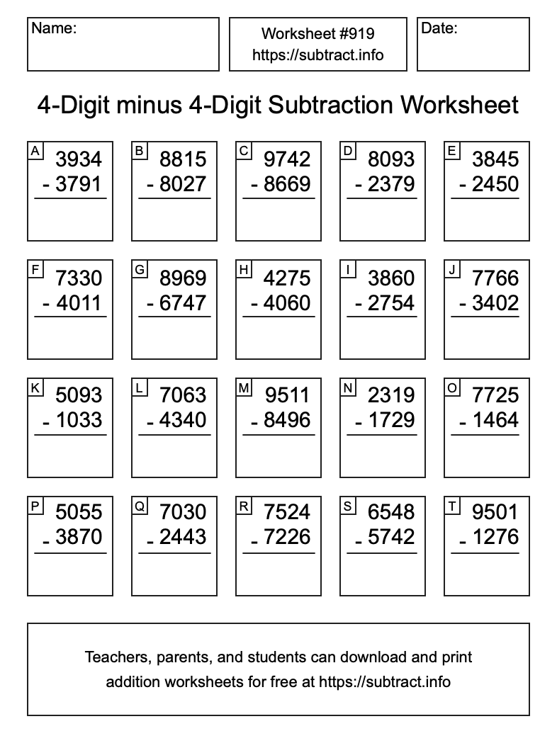 Here is the 4-Digit minus 4-Digit Subtraction Worksheet #919. Print and/or save the worksheet using the buttons below the image. You can also drag or right-click on the image to download it to your device.
