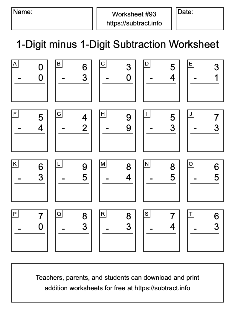 Here is the 1-Digit minus 1-Digit Subtraction Worksheet #93. Print and/or save the worksheet using the buttons below the image. You can also drag or right-click on the image to download it to your device.