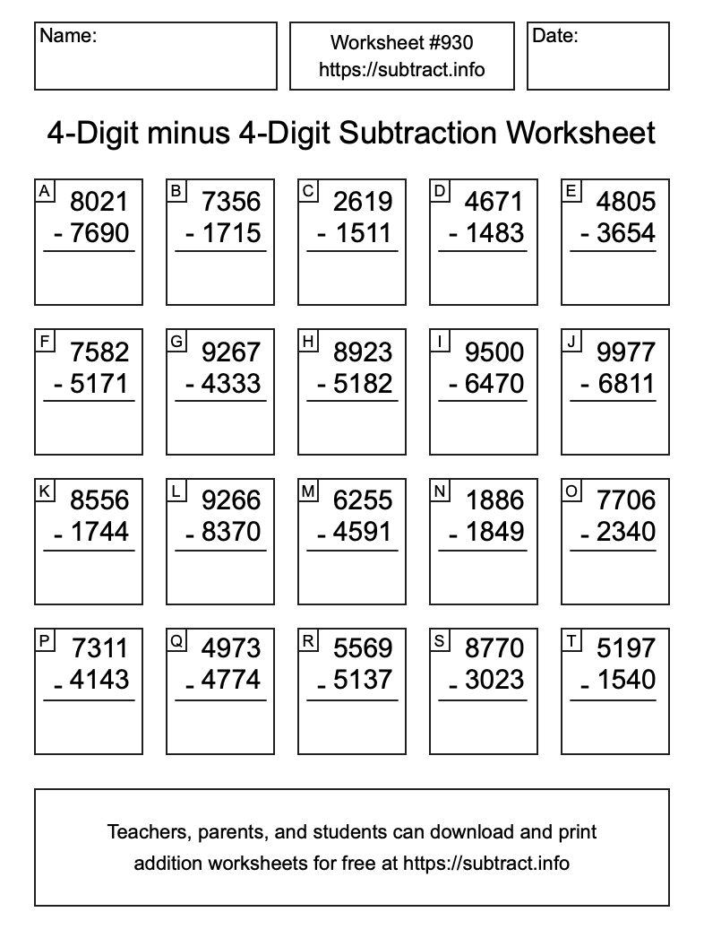 Here is the 4-Digit minus 4-Digit Subtraction Worksheet #930. Print and/or save the worksheet using the buttons below the image. You can also drag or right-click on the image to download it to your device.