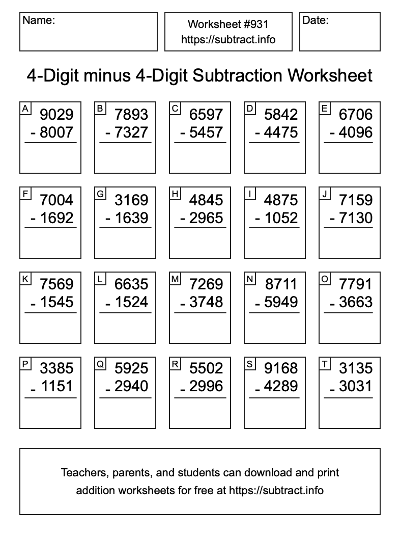 Here is the 4-Digit minus 4-Digit Subtraction Worksheet #931. Print and/or save the worksheet using the buttons below the image. You can also drag or right-click on the image to download it to your device.
