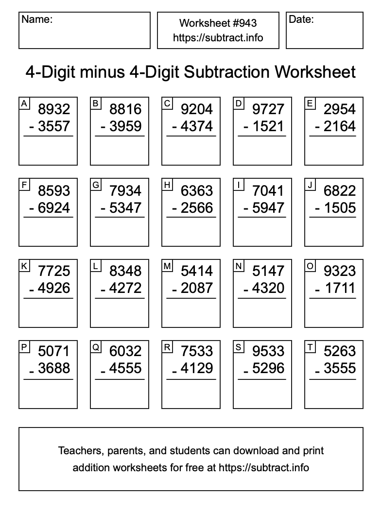 Here is the 4-Digit minus 4-Digit Subtraction Worksheet #943. Print and/or save the worksheet using the buttons below the image. You can also drag or right-click on the image to download it to your device.