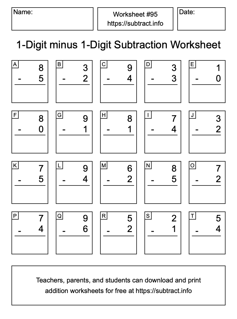 Go here to download, save, and print other subtraction worksheets. Information about how to find all solutions and how to reprint worksheets is also available here.