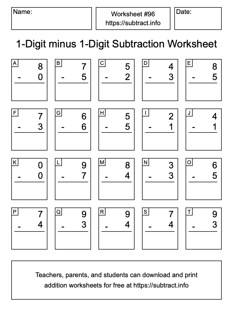 Go here to download, save, and print other subtraction worksheets. Information about how to find all solutions and how to reprint worksheets is also available here.