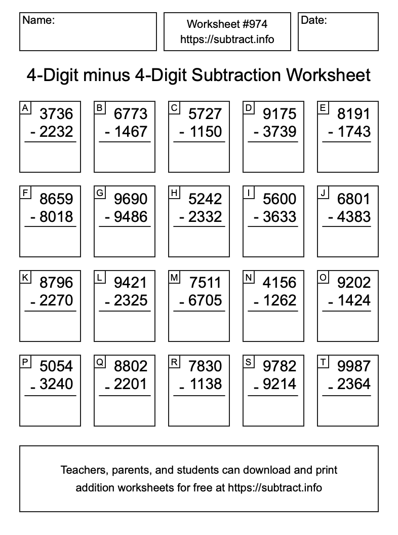 Here is the 4-Digit minus 4-Digit Subtraction Worksheet #974. Print and/or save the worksheet using the buttons below the image. You can also drag or right-click on the image to download it to your device.