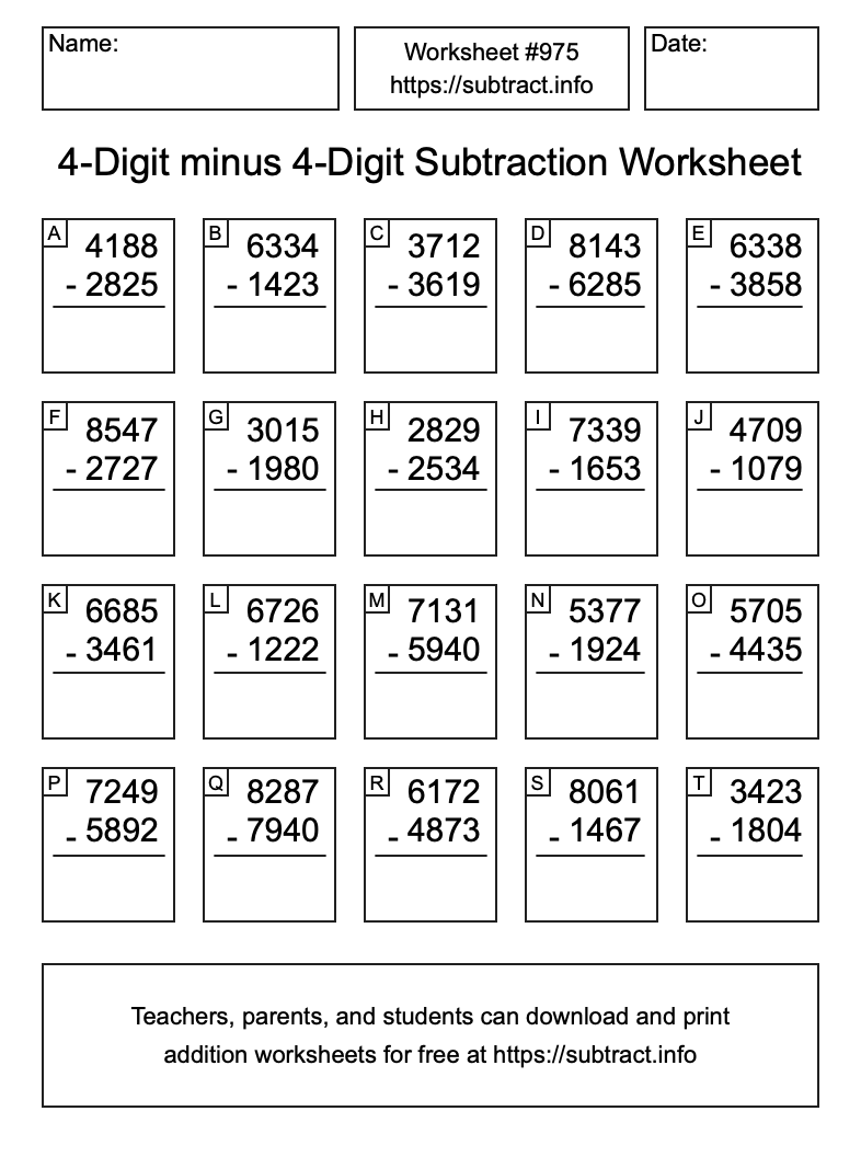 Here is the 4-Digit minus 4-Digit Subtraction Worksheet #975. Print and/or save the worksheet using the buttons below the image. You can also drag or right-click on the image to download it to your device.