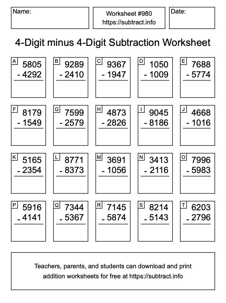 Here is the 4-Digit minus 4-Digit Subtraction Worksheet #980. Print and/or save the worksheet using the buttons below the image. You can also drag or right-click on the image to download it to your device.