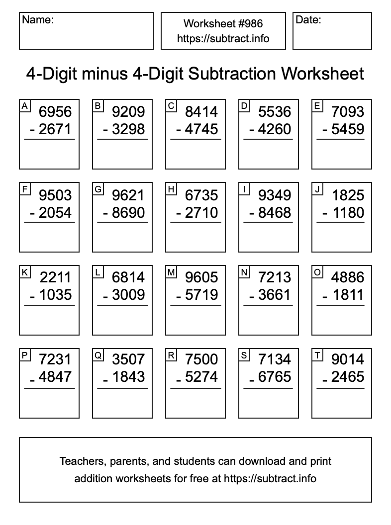 Here is the 4-Digit minus 4-Digit Subtraction Worksheet #986. Print and/or save the worksheet using the buttons below the image. You can also drag or right-click on the image to download it to your device.