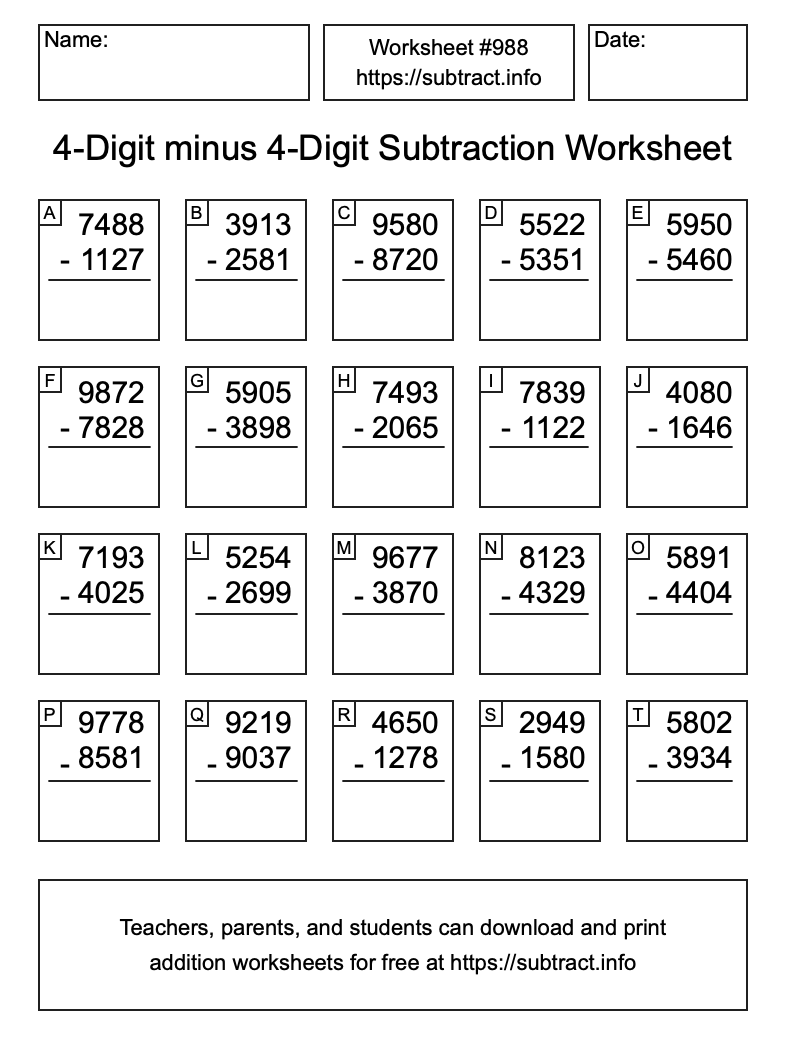 Here is the 4-Digit minus 4-Digit Subtraction Worksheet #988. Print and/or save the worksheet using the buttons below the image. You can also drag or right-click on the image to download it to your device.