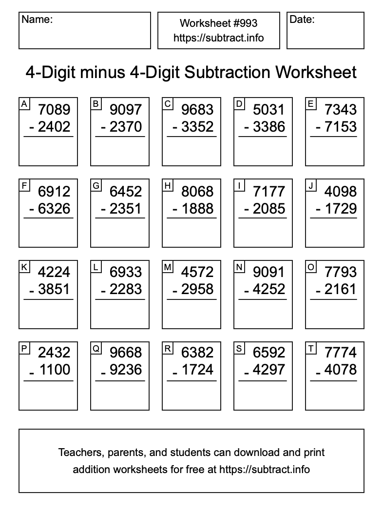 Here is the 4-Digit minus 4-Digit Subtraction Worksheet #993. Print and/or save the worksheet using the buttons below the image. You can also drag or right-click on the image to download it to your device.