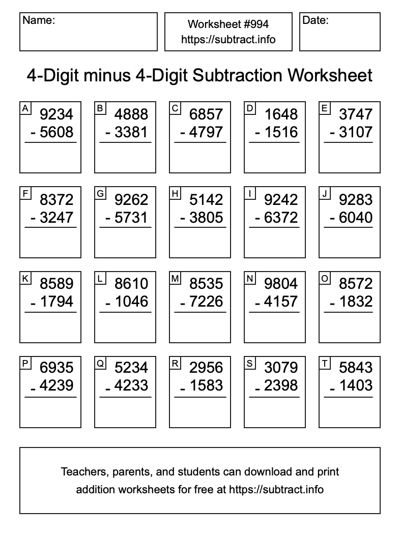 Here is the 4-Digit minus 4-Digit Subtraction Worksheet #994. Print and/or save the worksheet using the buttons below the image. You can also drag or right-click on the image to download it to your device.