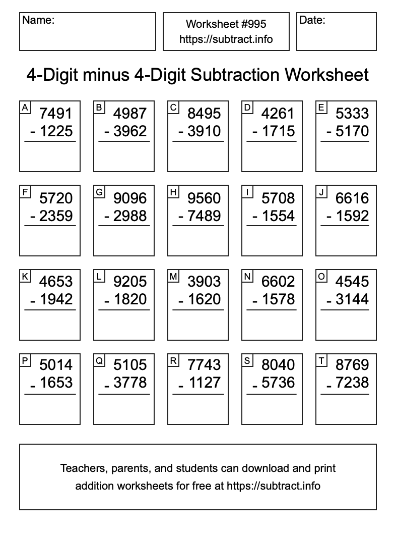 Here is the 4-Digit minus 4-Digit Subtraction Worksheet #995. Print and/or save the worksheet using the buttons below the image. You can also drag or right-click on the image to download it to your device.