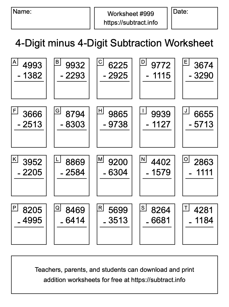 Here is the 4-Digit minus 4-Digit Subtraction Worksheet #999. Print and/or save the worksheet using the buttons below the image. You can also drag or right-click on the image to download it to your device.